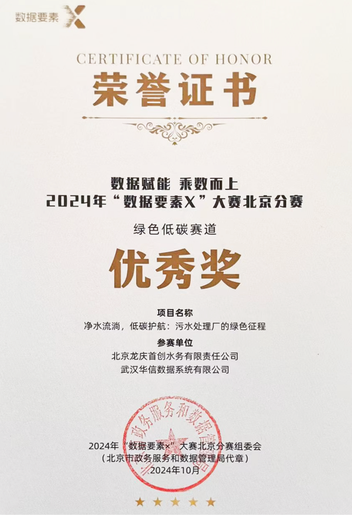 大赛北京分赛区是全国20个赛区中最重要的赛区,奖项评审由6位院士领衔的专家团队完成。武汉千亿国际(中国)数据系统有限公司与北京龙庆首创水务有限责任公司合作的项目,凭借其在污水处理领域的创新性应用以及对数据要素的有效利用,赢得了评委的高度认可。